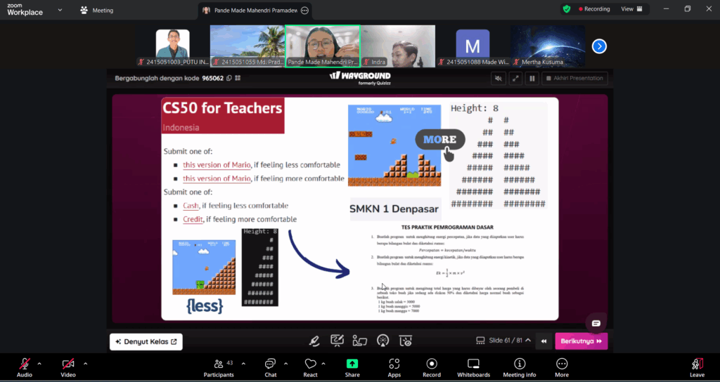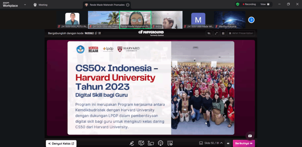 Kegiatan Program Praktisi Mengajar untuk mata kuliah Strategi dan Inovasi Pembelajaran Teknik Informatika telah sukses diselenggarakan pada Kamis, 9 Oktober 2025. Kegiatan yang berlangsung secara daring via Zoom Meeting pada pukul 19.00 – 21.00 WITA ini diikuti secara antusias oleh 33 mahasiswa semester 3 Program Studi Pendidikan Teknik Informatika (PTI), Universitas Pendidikan Ganesha (Undiksha). Kolaborasi ini merupakan bagian dari komitmen program studi dalam menyelaraskan kurikulum dengan kebutuhan nyata di lapangan, sekaligus mengimplementasikan semangat Merdeka Belajar Kampus Merdeka (MBKM).