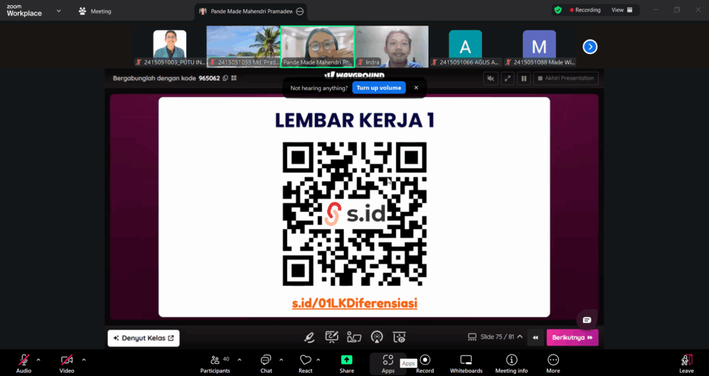 Pada sesi inti, Ibu Pande Made Mahendri Pramadewi memaparkan urgensi Pembelajaran Berdiferensiasi sebagai kunci mewujudkan kesetaraan belajar dengan mengakomodasi keragaman karakteristik siswa, baik dari segi kesiapan belajar, minat, maupun profil belajar. Materi disampaikan secara sangat deskriptif dan aplikatif melalui studi kasus nyata dari pengalaman mengajar beliau di SMK Negeri 1 Denpasar, dengan fokus pada tiga pilar diferensiasi: